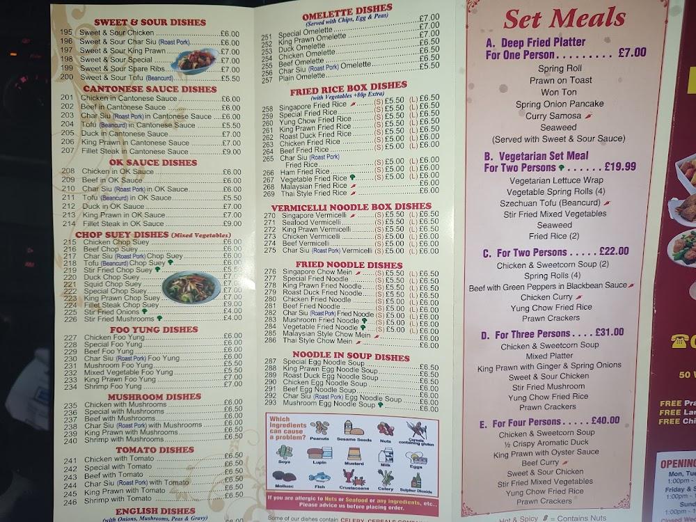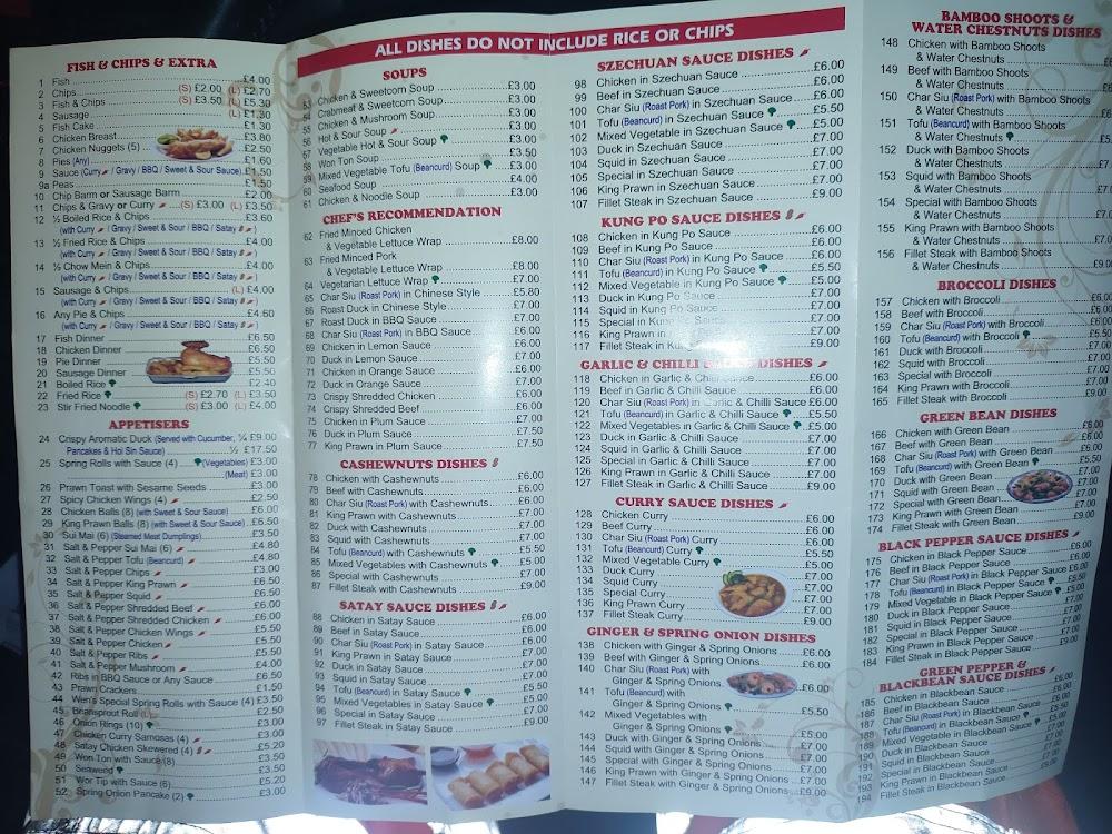 Wen Menu boasts an extensive menu that caters to a variety of tastes. Dishes range from aromatic starters like crispy aromatic duck and spring rolls to hearty main courses featuring beloved Chinese favorites. Signature offerings include salt and pepper dishes, flavorful curries, and classic chow mein. The chef's recommendations spotlight dishes such as char siu in BBQ sauce and chicken in lemon sauce, ensuring a taste of excellence with every bite. Vegetarian options are also available, highlighting tofu and mixed vegetables in Szechuan sauce or stir-fried with ginger and spring onions. The extensive selection of satay sauce dishes and sweet and sour meals further broadens the appeal, ensuring that there's something for everyone.